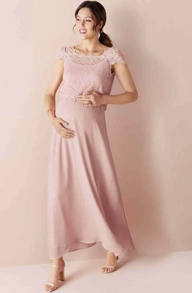 Un vestido con el que ser centro de miradas en cualquier reunión. Este vestido premamá Lidl es el que necesitas: largo, de mangas cortas y color rosa con acabados en encaje para ese look elegante.