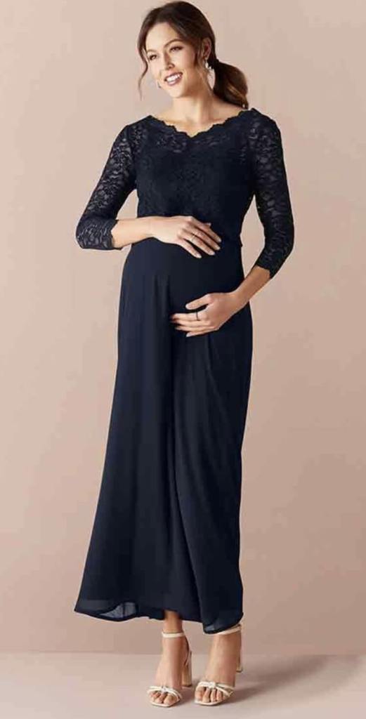 Este traje es perfecto para las mamás que quieren estar cómodas sin renunciar al color y la elegancia. Es un vestido premamá Lidl es largo y color oscuro, con un estampado floral muy bonito por si quieres lucir distinguida.
