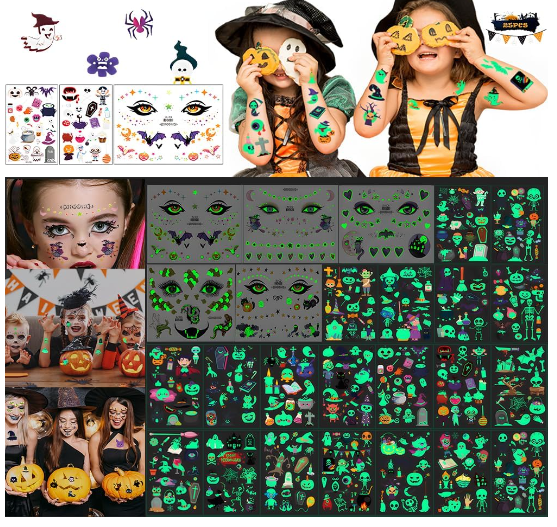 Los tatuajes que se fijan con agua suelen triunfar entre los más pequeños, les apasiona decorar sus brazos y piernas. La peculiaridad de este producto es que los tatuajes brillan en la oscuridad, algo que los hace un hombre más atractivos y divertidos. Los pequeños podrán elegir entre diferentes diseños como una calabaza, un murciélago, un vampiro, una bruja… ¡creatividad sin límites!