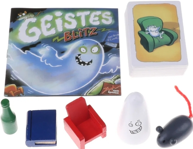 El jugo incluye un total de cinco objetos: un fantasma, un sillón rojo, una botella verde, un libro azul y un ratón; además de multitud de cartas con diferentes estampados. Se trata por tanto de un juego de mesa entretenido y divertido que podemos usar tanto en casa, como en el colegio o en sesiones psicopedagógicas.