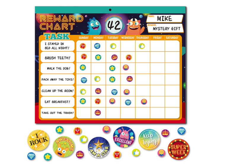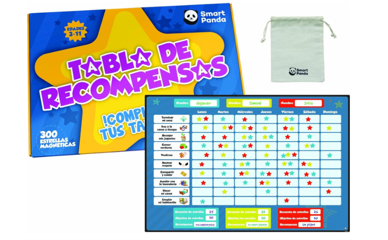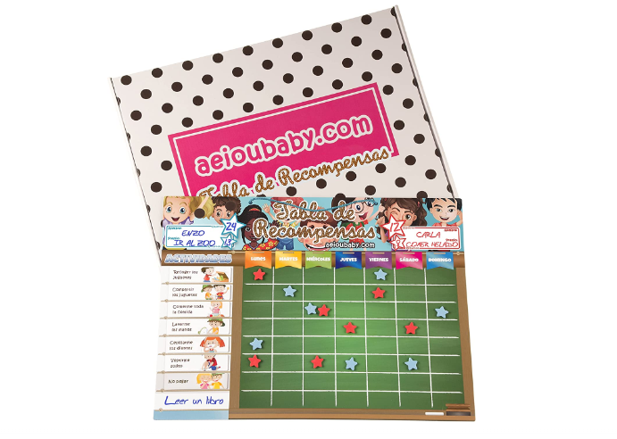 Esta primera alternativa incluye un tablero magnético (ideal para ahorrar espacio y colocarlo en tu nevera), además de un total de 20 tareas entre las que podrás elegir cuál quieres trabajar con tus peques. Además, tendrás un total de 300 estrellas para ir marcando aquellas actividades que tus hijos vayas realizando.