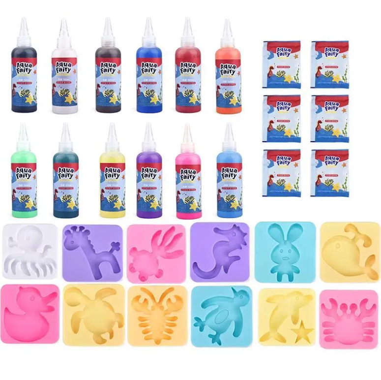 Con este set de pintura los niños y niñas podrán elaborar diferentes animales mágicos sumergibles en el agua. Están incluidos 5 botes de 50mlmde diferentes colores, varios moldes de diversos personajes y dos sobres con la mezcla que debemos echar junto a la pintura. Además, ¡brillan en la oscuridad!
