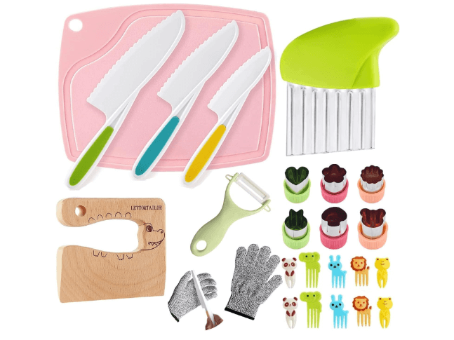 Este set culinario incluye 3 cuchillos de diferentes tamaños que nuestros peques podrán usar sin correr ningún tipo de peligro. Además, en él encontraremos un juego de guantes para no quemarnos, un cortador para dar forma a nuestras patatas o verduras y diferentes sellos de animales para decorar. Sin duda un set de lo más divertido.