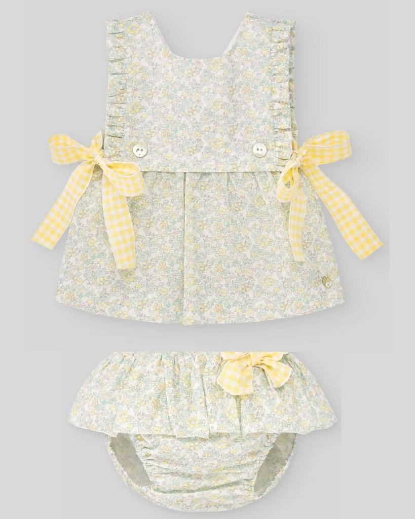 Este vestido con braguita en tono verde agua y detalles de lazos en amarillo es perfecto para ocasiones especiales. Tu hija se verá ideal con estos tonos tan elegantes y sencillos.