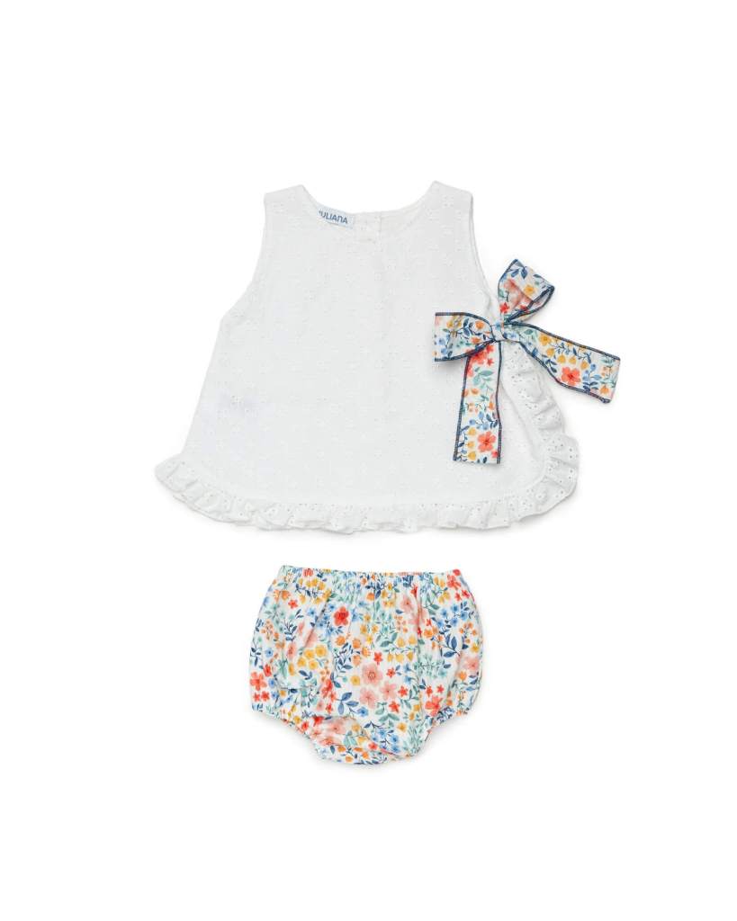 El blanco transmite inocencia y pureza, y combinado con flores en colores vibrantes, hace que este conjunto tenga ese toque de frescura y originalidad tan divertido.
