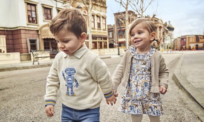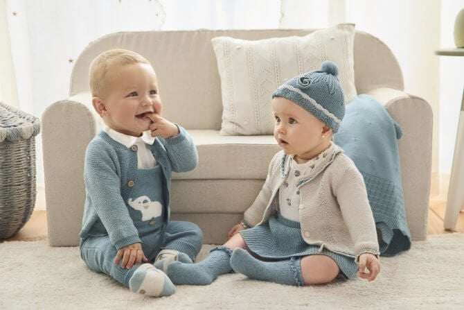 La línea Baby (desde los 6 hasta los 36 meses) destaca por sus estampados alegres, toques de glitter en las prendas y looks de punto en todas sus versiones. Además, dentro de la categoría Baby, niño y niña comparten outfits con la misma temática y colorido, permitiendo combinaciones entre hermanitos.