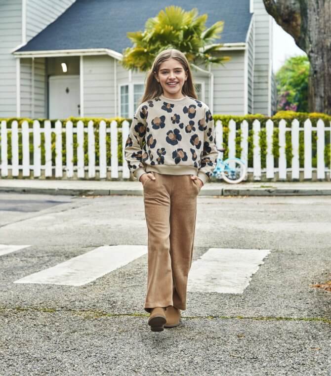 La propuesta para ellas se completa con las líneas Mini (de 2 a 9 años) y Junior (de 8 a 16 años), en las que destacan el print floral en forma de sudaderas o jerséis; los pantalones de corte flare o slouchy en tonos tierra y negro y las faldas pantalón de cuadros vichy, un estampado atemporal que nunca pasa de moda.