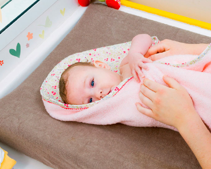 Al secarle, túmbale sobre el cambiador y envuélvele rápidamente para evitar que se enfríe. Sécale sin frotar, insistiendo mucho en los pliegues. Si le has lavado la cabecita, sécala también con la toalla muy suavemente.
