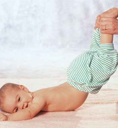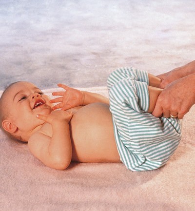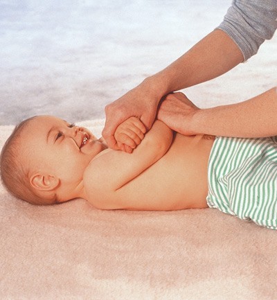 Con mucho cuidado, dóblale las dos piernas a la vez acercando las rodillas a la tripa. Déjalas así 10 segundos. Este ejercicio da movilidad a sus caderas, y la presión contra la tripita le ayuda a expulsar los gases.