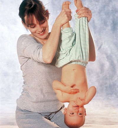 Esta posición, que divierte tanto a los bebés mayores (no se debe hacer antes de los seis meses), fortalece la columna. Hay que cogerle con mucho cuidado y mantenerle así solo durante dos o tres segundos.