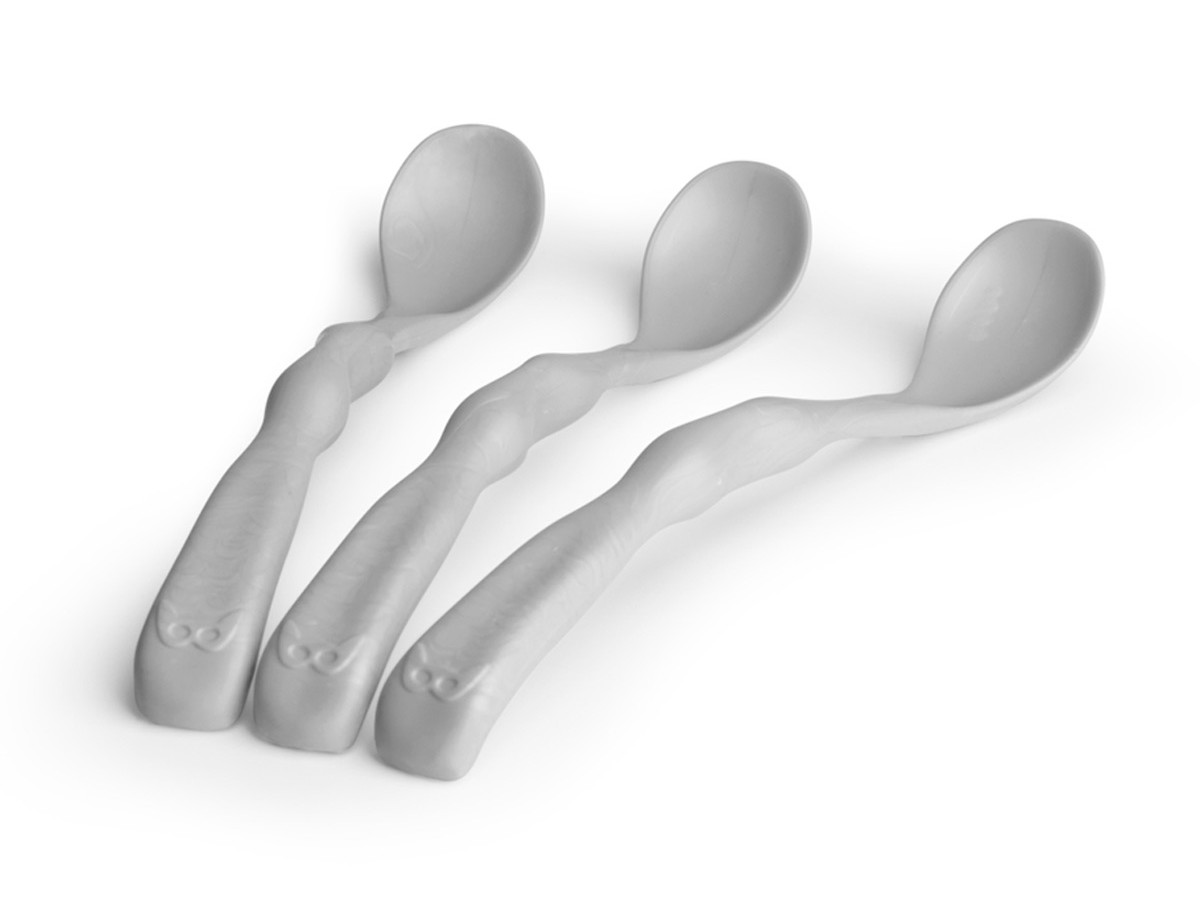 La superficie de estas precucharas son planas y sus dos caras son iguales, de ese modo el bebé siempre la cogerá bien. Contiene dos cucharas, la verde tiene una superficie hueca parar atrapar purés más espesos y la gris es mejor para adherir la comida en su superficie en relieve.Precio: 12.95 euros