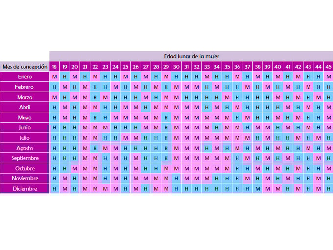 La tabla china es uno de los métodos más antiguos y más extendidos para la predicción de la sexualidad del bebé, se basa en la edad lunar de la madre en el momento en que se quedó embarazada y el mes en el que se concibió al bebé. Al parecer esta tabla se usaba hace más de 700 años y fue encontrada por un científico chino en una tumba de una familia real.