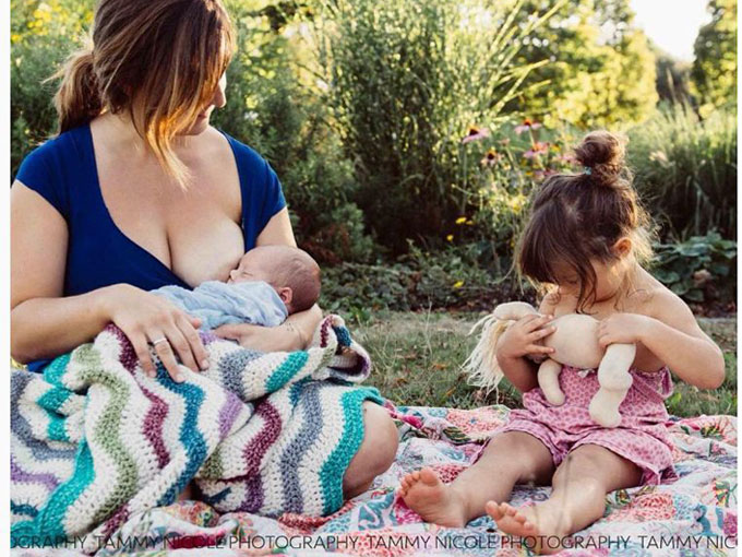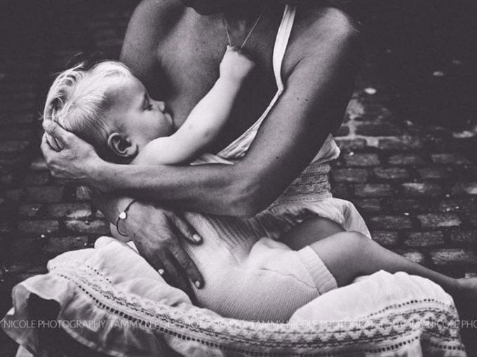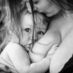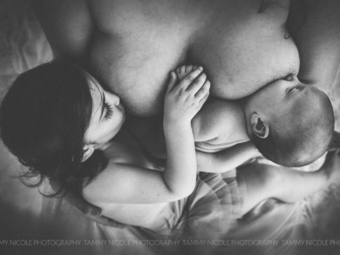 En esta fotografía podéis ver como una mamá alimenta a sus dos hijos en tándem, es decir, tanto a la mayor como al pequeño les sigue dando el pecho y ellos maman a la vez.Si queréis saber más sobre la lactancia en tándem, os lo contamos aquí.