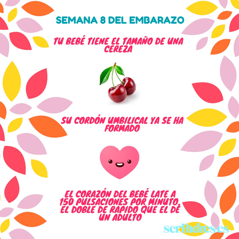 El bebé pasa a medir lo mismo que una cereza. ¡Ojo con el cambio de tamaño! En cuanto a desarrollo, aquí tiene lugar el desarrollo completo de su corazón.