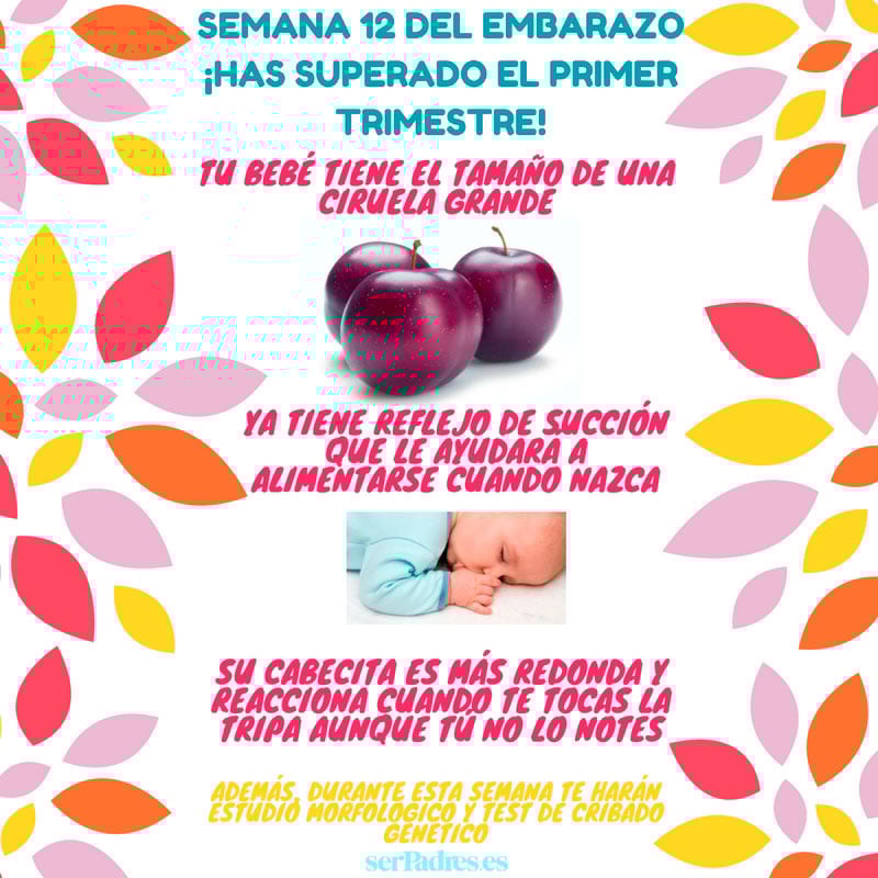 En la última semana del primer trimestre, la semana doce, el tamaño del feto se asemeja a una ciruela grande y ya tiene algunos reflejos.