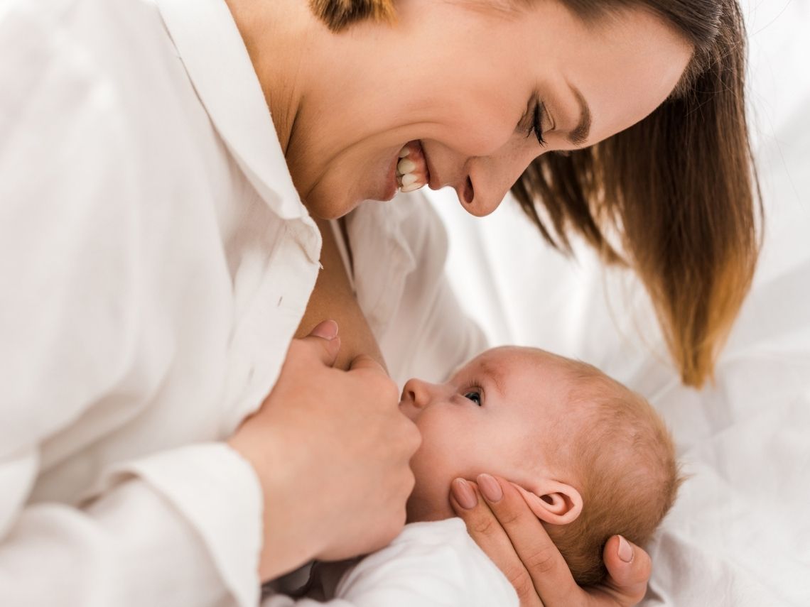 Para realizarla deberás colocar al bebé mirando hacia arriba y tú de rodillas cerca de su cabeza. Después, acercarás el pecho a su boca.