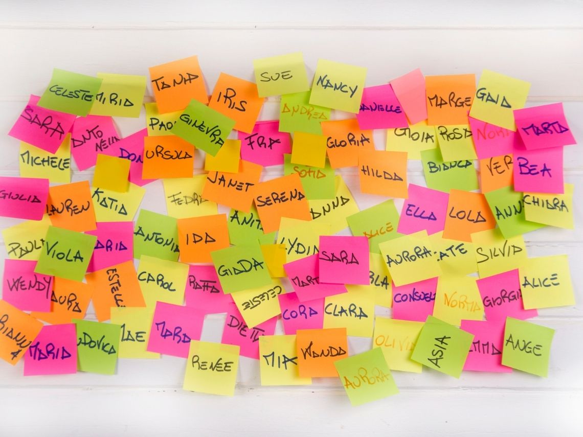 Una lista en la que estén contemplados todos los nombres de niño y nombres de niña que te gusten o que te agraden cómo suenan, o cómo se escriben. Intenta que no quede ninguno fuera, sin importar lo larga que sea la lista.En algún momento habrá tiempo de depurarla.