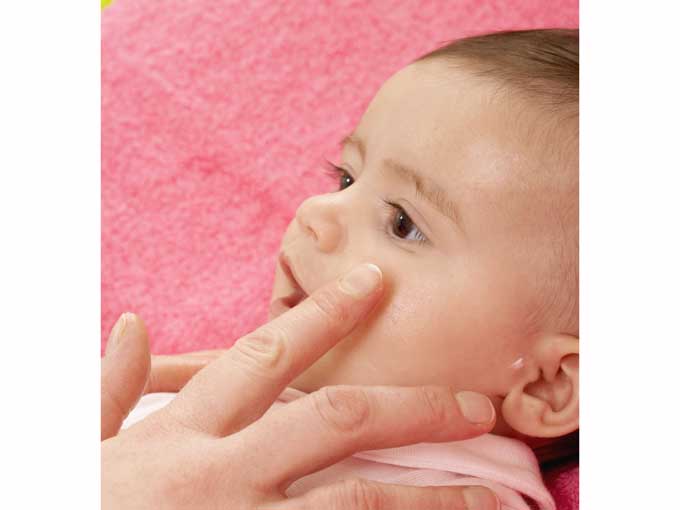 Antes de salir a la calle, conviene echarle en la cara una crema facial para bebés que le proteja del aire y sol. También ocurre que, a veces, el exceso de babas irrita la barbilla y la piel que rodea la boca. Si ocurre, es importante secar al niño a menudo e hidratar la zona regularmente. Pregunta en la farmacia, ya que hay cremas específicas para esta afección.