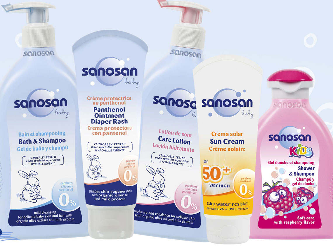bebé, así como para niños de 2 a 6 años con su línea sanosan Kids. Productos para el baño, lociones corporales, cuidados de la zona del pañal, protección solar... Podrás encontrar los productos Sanosan de venta exclusiva en farmacias y parafarmacias.