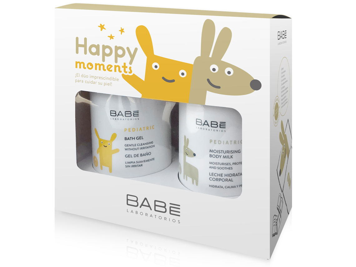 Cuidar y respetar la dermis de los más pequeños es básico, por eso, el pack pediátrico de Babé Happy Moments está compuesto por gel de baño y leche hidratante. Están formulados con el Complejo Baby-Care BABÉ, que combina extractos vegetales de Caléndula, Mimosa y Aloe Vera, los cuales calman y suavizan la piel. El gel de baño es muy suave, ideal para limpiar a diario la sensible piel del niño. Su delicada fórmula respeta y mantiene la hidratación y protección natural, además de limpiar sin agredir la piel de los más pequeños. Por otro lado, la loción corporal es ideal para el cuidado e hidratación diaria de la piel del niño. Contiene Manteca de Kokum que ayuda a mantener y reforzar la función protectora natural de la piel. Su acción calmante e hidratante es inmediata gracias a su rápida absorción.