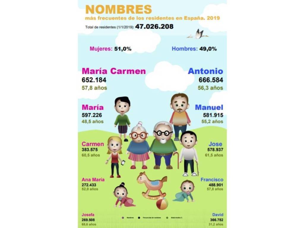 En cuanto a las mujeres, Maria Carmen es el más habitual, más de 650.000 personas contaban con tal nombre en 2019. En segunda posición y muy de cerca destaca María y, tras esta opción: Carmen, Ana María, Josefa, Isabel, María Pilar, María Dolores, Laura y María Teresa.