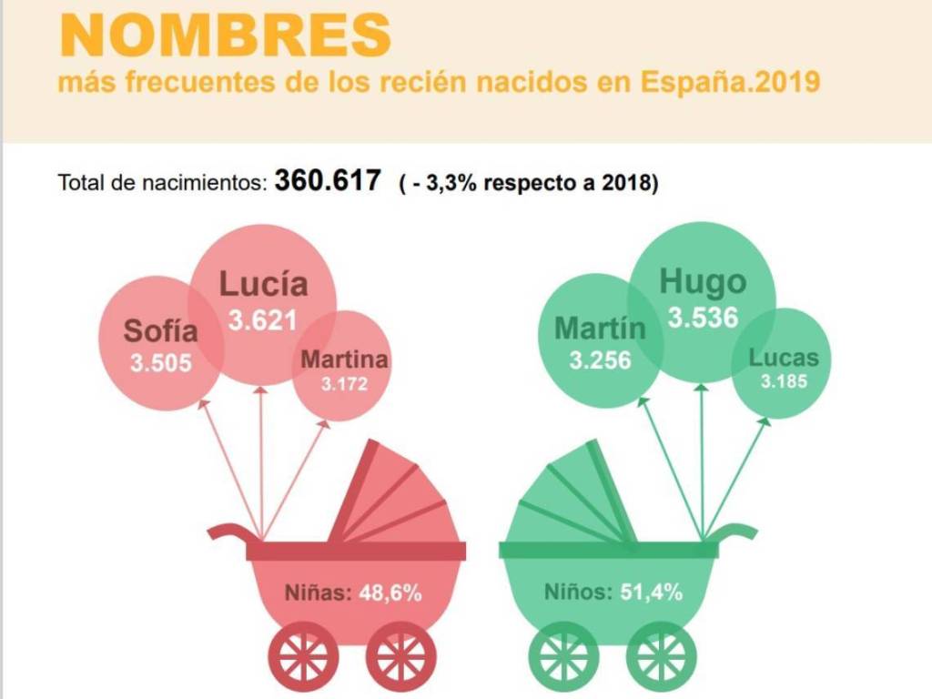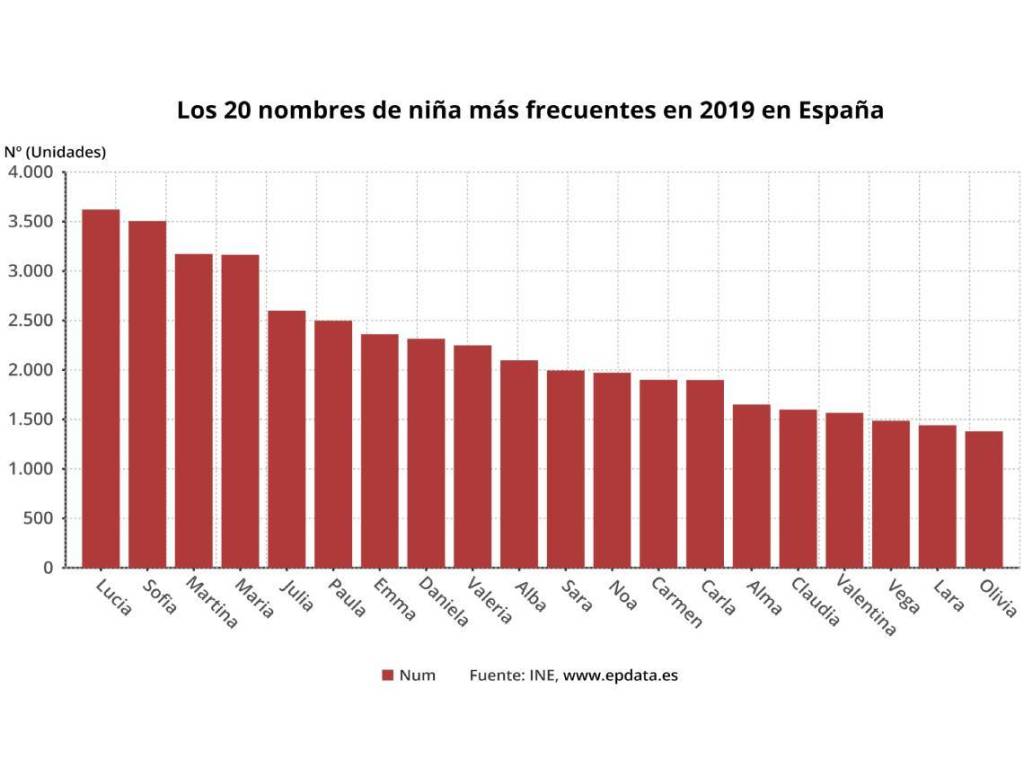 Por otra parte, en cuanto a los nombres de niña más frecuentes, para las recién nacidas, destaca Lucía, muy de cerca con Sofía y, tras estas opciones, Martina (un nombre muy utilizado en los últimos años), María, Julia y Paula.