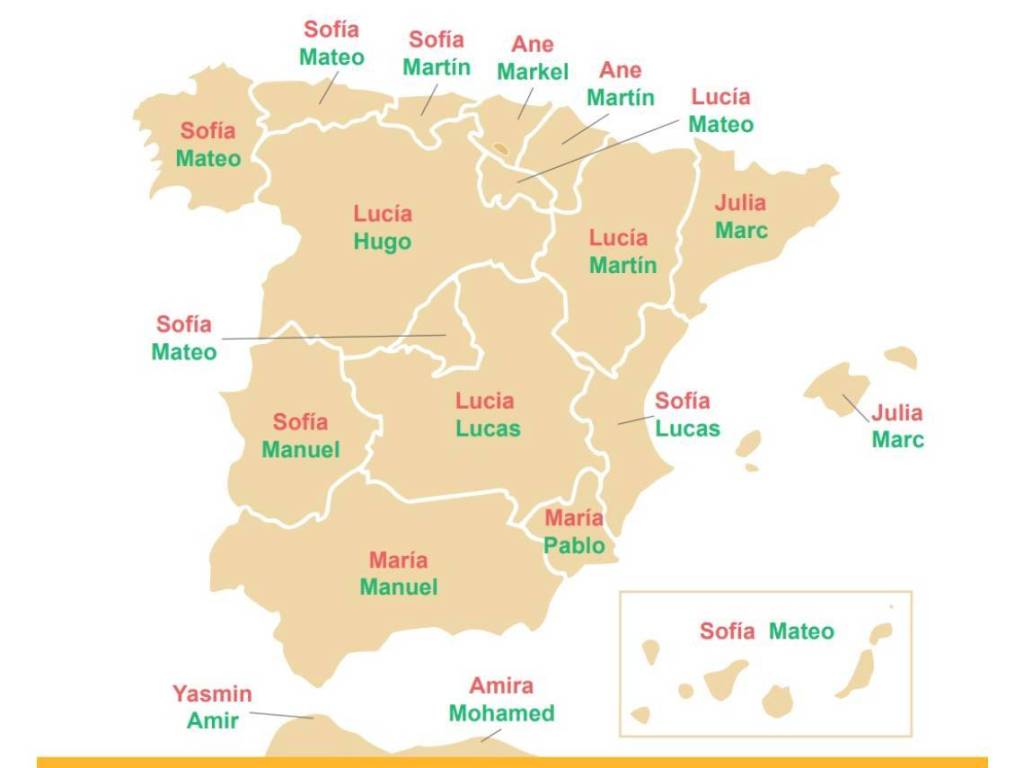 Para hacer una mayor precisión, si nos fijamos ahora en los nombres favoritos por comunidades autónomas españolas, encontramos lo siguiente: