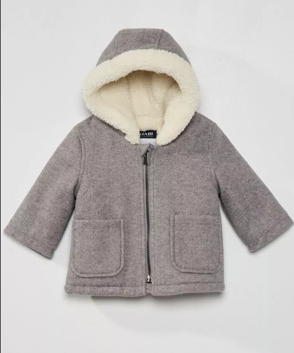 Abrigo de lana con forro de borreguito en color gris. Precio: 20 €.