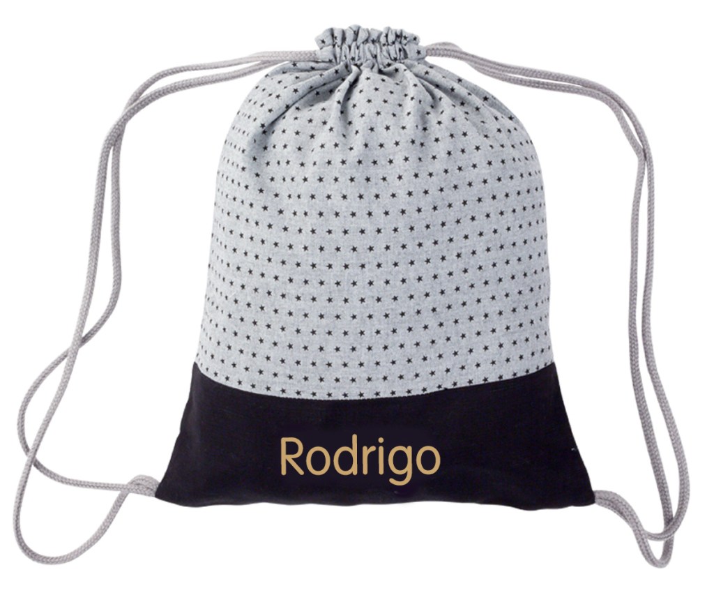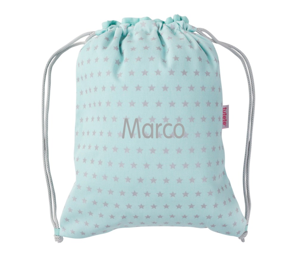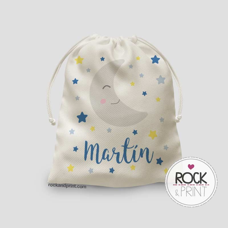 Puedes elegir el color que más os guste y personalizarla con el nombre del bebé. Tiene un tamaño de 20x25 cm, están confeccionadas en loneta poliester, se pueden lavar sin que el color ni el nombre se estropeen y tienen dos cordones para el cierre.