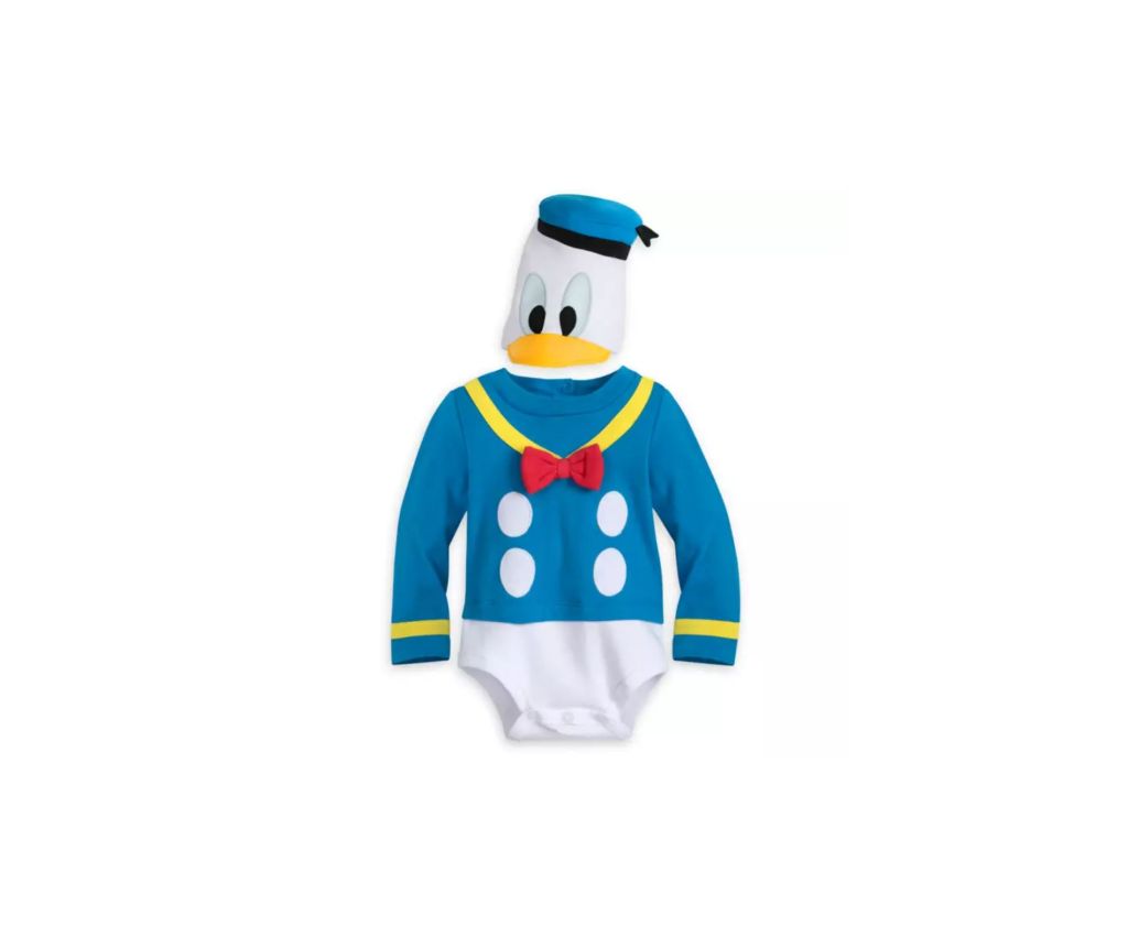 Quizás sea de nuestros favoritos de la lista: este disfraz de Pato Donald (con gorrito incluido) es l omás. Y lo es porque es un bodi normal, al que podrás incluir unas mallas o leotardos blancos y el niño irá calentito.