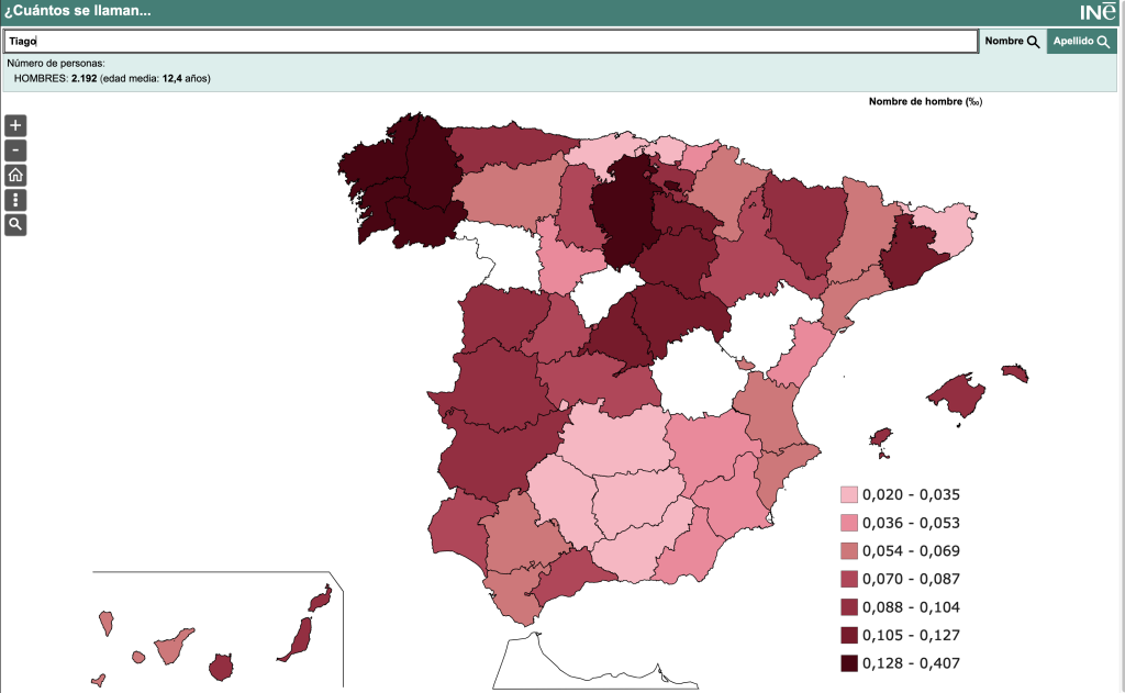 Si buscamos la otra variante, la cantidad de niños que se llaman Tiago, sin la “h” es bastante menor, no llegan a los 2.200 y se concentran sobre todo de nuevo en Pontevedra y también en A Coruña y Burgos. La media de edad es un poco más elevada que la anterior aunque no demasiado, en este caso supera los 12 años.