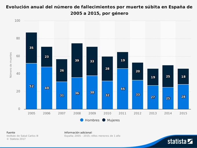 Esta estadística muestra la evolución anual del número de fallecimientos por muerte súbita en España de 2005 a 2015, por género. En el año 2015, fallecieron un total de 28 niños y 18 niñas por esta causa en España. El riesgo de muerte súbita es ligeramente superior en el caso de los varones.
