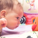 Los juguetes y objetos de colores vivos y con sonidos llamativos son perfectos en esta etapa, y más si permiten al bebé interactuar: un pañuelo vistoso de mamá que cambia de forma cuando el niño lo arruga, una caja con algo dentro que suena cuando él lo agita, los peluches…