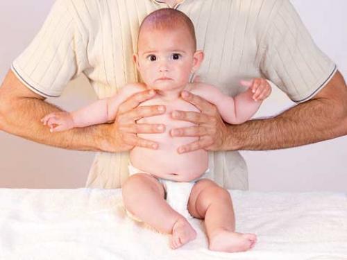 Cuando la mucosidad ha llegado a los bronquiolos, la fisioterapia respiratoria ayuda a que regrese a la garganta. Antes de realizar las maniobras es importante conocer la respiración del lactante. La tripita del bebé sale y entra; cuando sale, coge aire y cuando entra, lo suelta. Hay que comprimir con las manos hacia dentro justo cuando la tripa entra para ayudarle a soltar todo el aire. Sienta al bebé desnudo (solamente con el pañal), de forma que su espalda quede en contacto con tu tripa. Rodéale el abdomen con las manos, una sobre su pecho y la otra sobre la tripa, y ejerce una ligera compresión hacia dentro, en dirección a tu ombligo.
