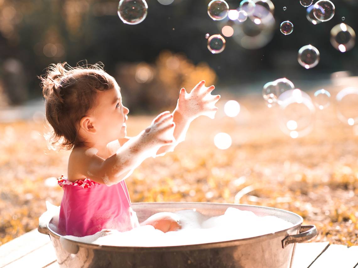 Algo que es muy simple, pero que a los niños pequeños les fascina verdaderamente son las burbujas. Lo que podemos hacer es rellenar un recipiente con agua y jabón, para que después con una pajita se entretengan soplando a través de ella y formen las burbujas. También podemos hacer nosotros las pompas y que ellos se dediquen a perseguirlas y explotarlas.
