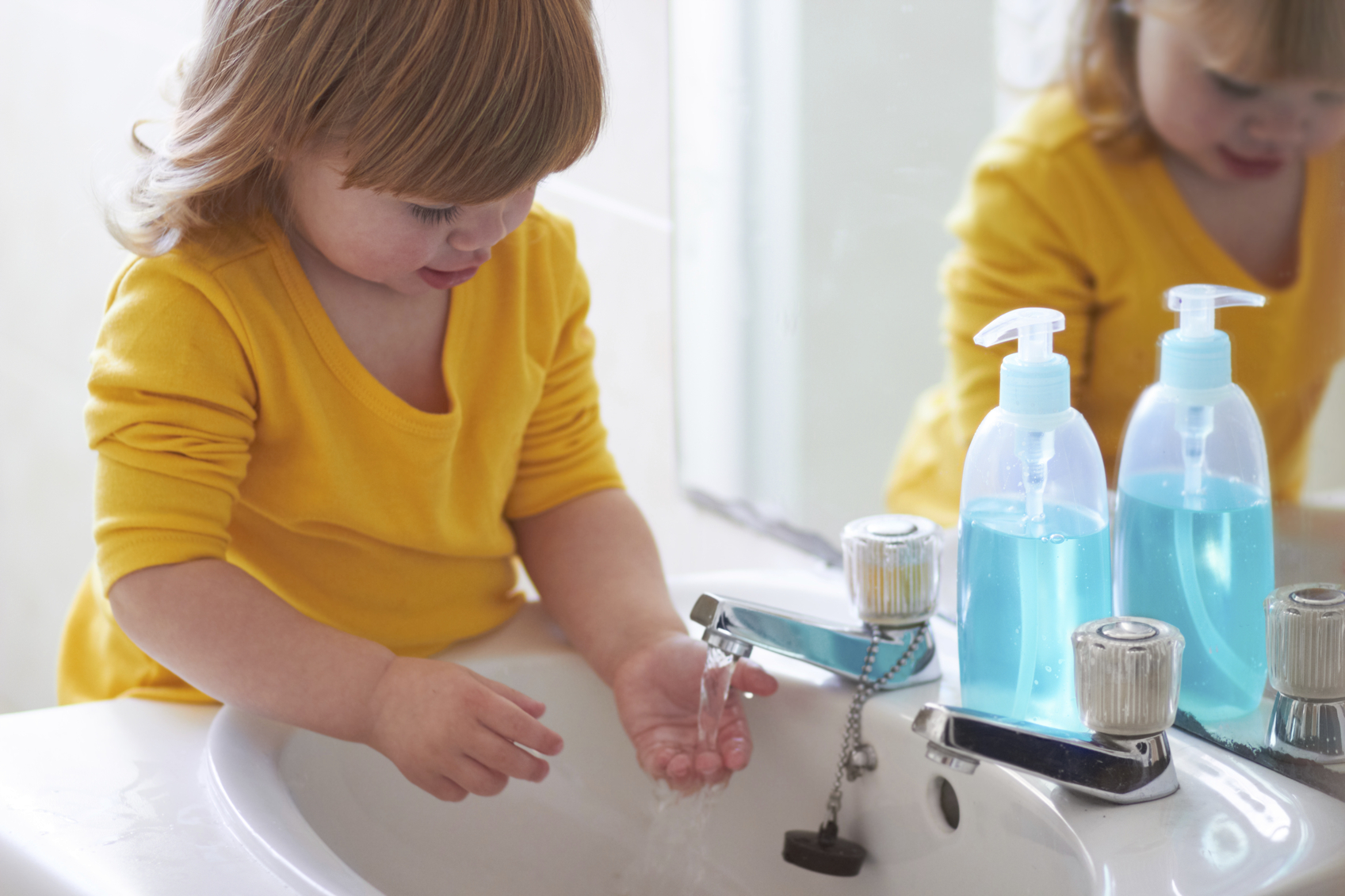 Con la ayuda de un peldaño para llegar al lavamanos tu hijo es capaz de lavarse las manos antes y después de comer, un hábito muy recomendable de adquirir.