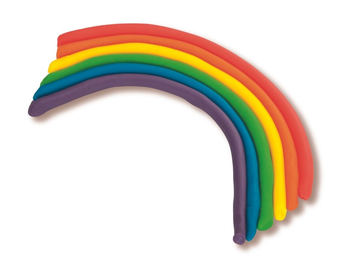 Play-Doh propone un arcoíris supersencillo. Necesitaréis: plastilina de siete colores diferentes y algo para cortarla.