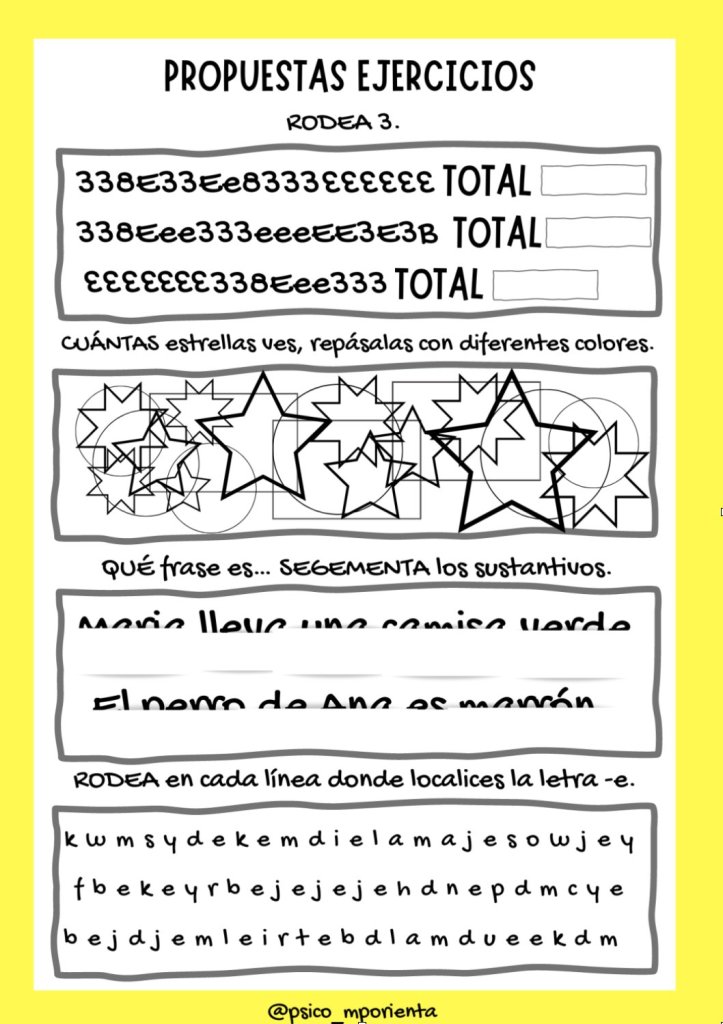 Eso sí, recuerda que cada ejercicio debe ir acompañado de un ejemplo inicial (“coge tu lápiz de color y mira como rodeo la leta-e”) para facilitar la comprensión del mismo. Los ejercicios que van acompañados de imágenes son un referente facilitador a la hora de captar la atención del niño y establecer una adecuada asociación enunciado-representación visual, es decir, ofrecerles a estos niños la opción de captar la información presentada por diferentes canales.