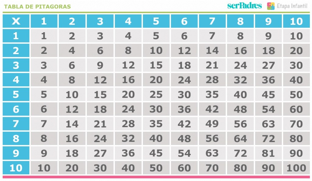 La tabla de Pitágoras o tabla pitagórica es una forma alternativa y más compacta de representar las 10 tablas de multiplicación. Fue desarrollada por el famoso matemático Pitágoras hace siglos pero aún hoy sigue siendo muy útil para que los niños aprendan a multiplicar. La clave de su eficacia radica en que ayuda a visualizar de forma muy simple las multiplicaciones, a la vez que refleja de forma más clara algunas propiedades matemáticas como la conmutativa, la propiedad de intercambiar el orden de los factores sin que se altere el producto, lo cual le ayuda a los pequeños a apropiarse con más facilidad de este contenido.