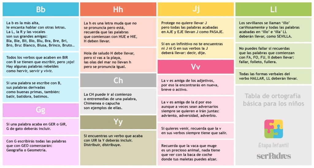 Otra estrategia muy efectiva para enseñarle ortografía a un niño consiste en presentarle las tablas básicas de ortografía con trucos. Puedes encontrar distintos tipos de tablas de ortografía, ya que cada una se sustenta en recursos didácticos diferentes, ya sean imágenes, rimas o secuencias. Básicamente, se trata de que el pequeño memorice el contenido de la tabla, de manera que pueda reproducirlo más adelante sin necesidad de recurrir a ella. Por eso, lo ideal es que tenga la tabla siempre a mano, al menos hasta que logre “fotografiarla mentalmente”.