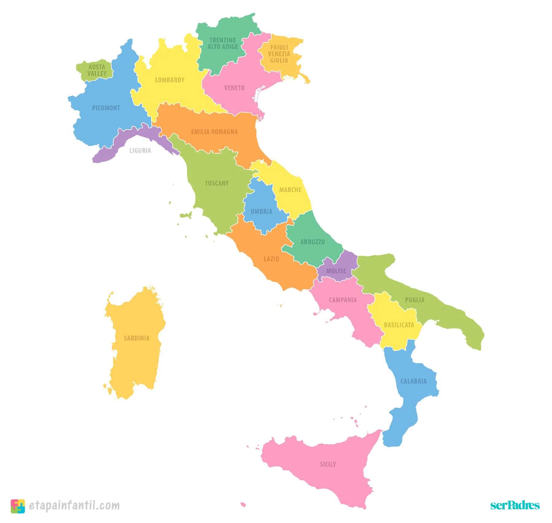 Estas son las 20 regiones de Italia: Lombardía, Basilicata, Friuli-Venezia-Giulia, Piamonte, Valle de Aosta, Abruzzos, Toscana, EmiliaRomaña, Marcas, Trentino-Alto, Adigio, Liguria, Umbria, Lazio, Molise, Apulia, Calabria, Campania, Véneto, Sicilia y Cerdeña.