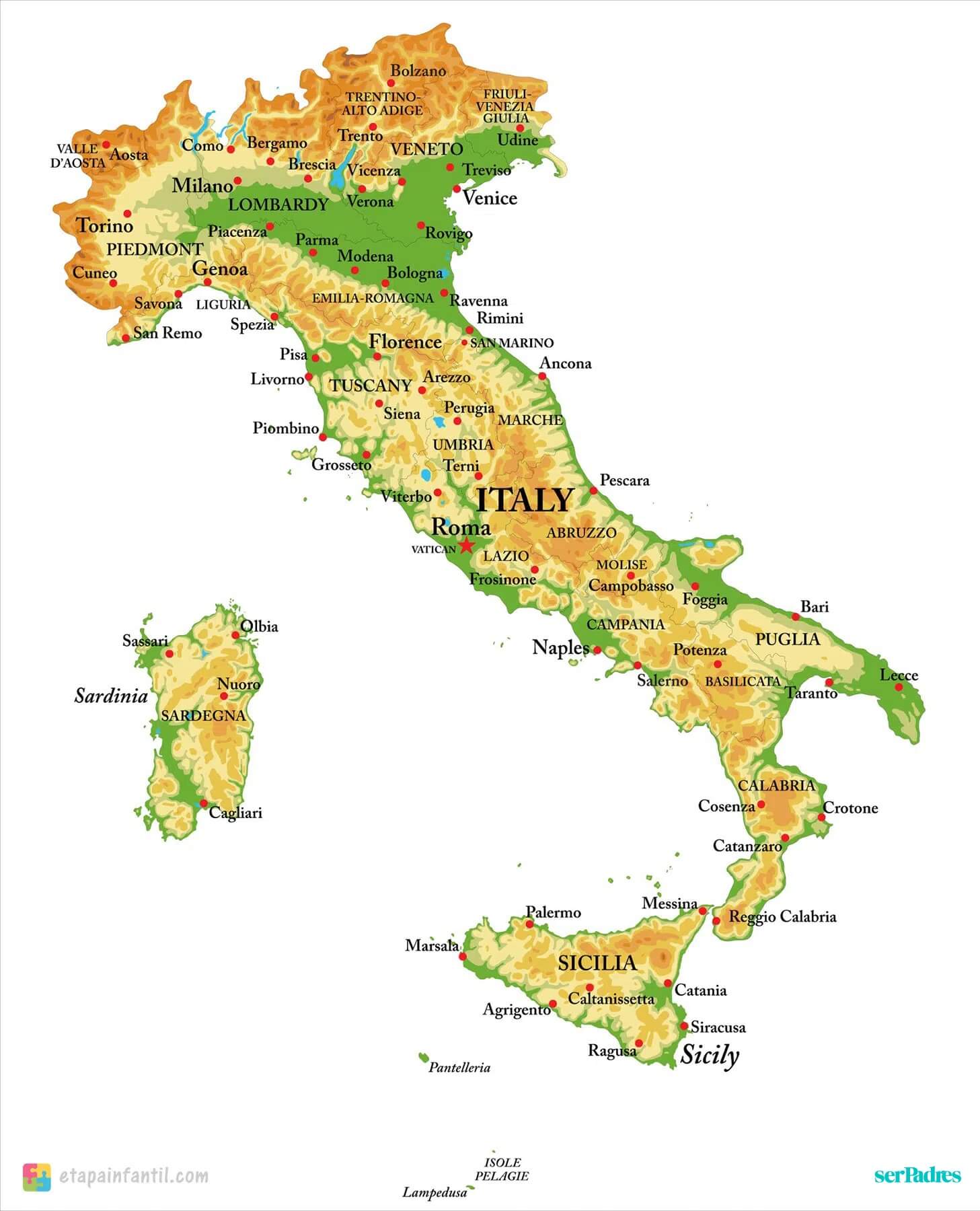 Descarga aquí el mapa físico de Italia para imprimir.