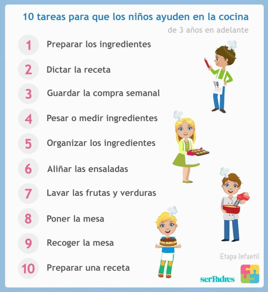 - Pesar o medir ingredientes. Una tarea segura que los pequeños pueden hacer en la cocina es medir o pesar los ingredientes de las recetas. Se trata de una forma diferente de aprender algunas nociones de matemáticas, como sumar o restar, además de hacerles sentir importantes.