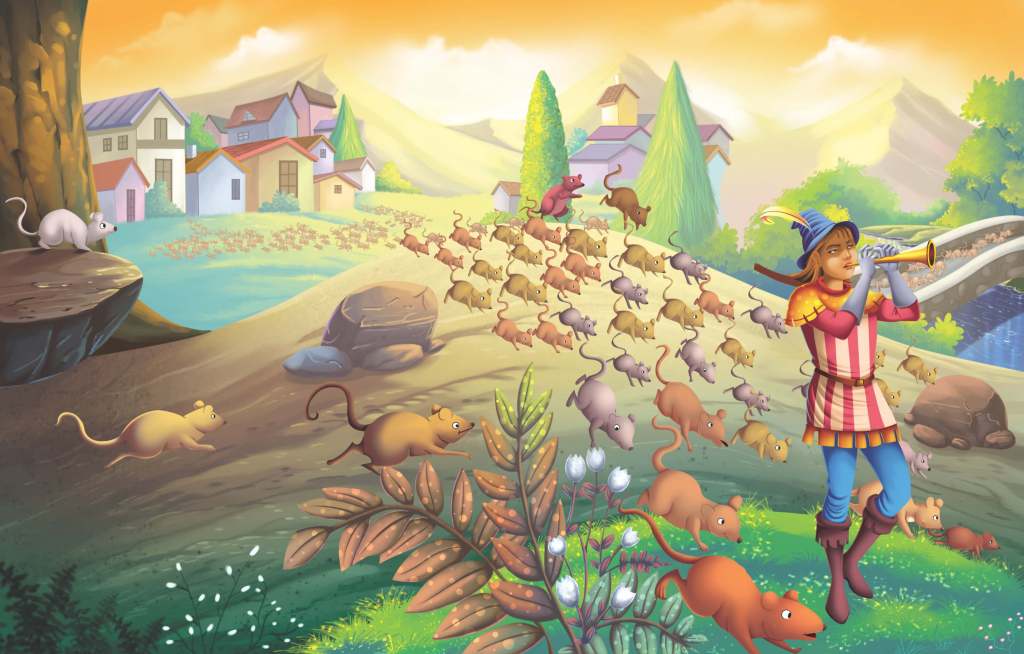 Durante los días siguientes, muchos hombres intentaron todo para conseguir alejar a los ratones de la ciudad. Sin embargo, todos los esfuerzos eran en vano, cada día aparecían más ratones. Ya habían perdido las esperanzas cuando un día se presentó ante el Consejo un hombre alto y desgarbado, un flautista del que nadie había escuchado hablar antes. Llevaba una misteriosa capa que le cubría desde el cuello hasta los pies. El hombre se limitó a afirmar: