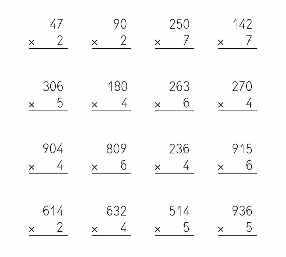Amplía aquí la ficha de multiplicaciones de tres números por una cifra.