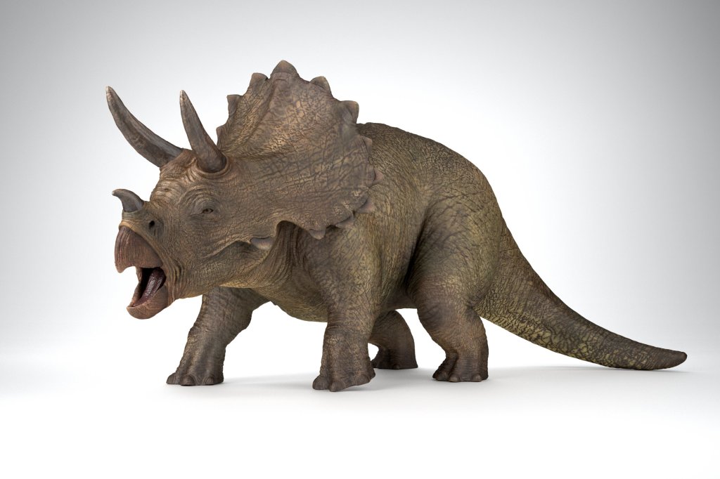 El Triceratops medía entre 8 y 9 metros de largo y pesaba entre 4 y 6 toneladas. También era un dinosaurio impresionante que contaba con tres cuernos en la cabeza, una placa en forma de escudo en la parte posterior del cráneo y un característico pico curvado.