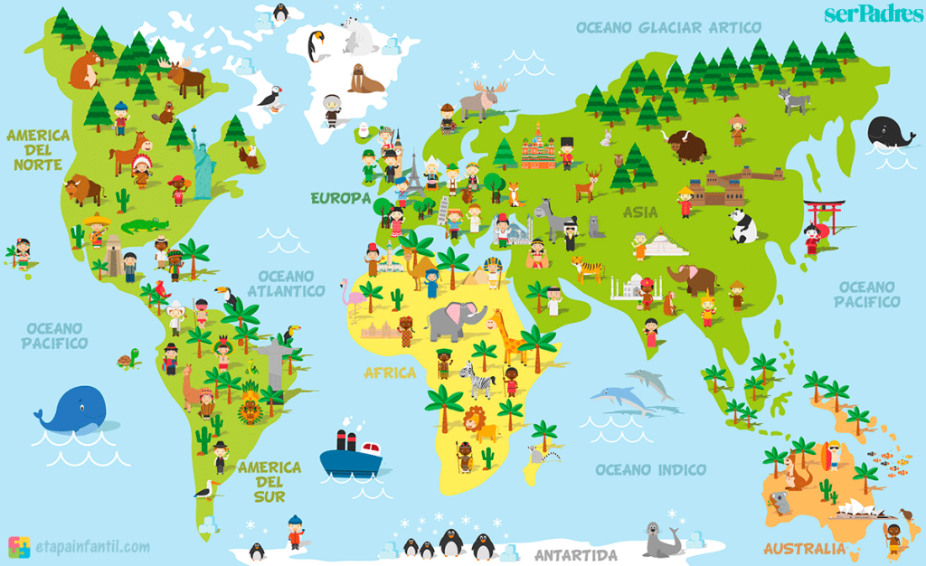 Los mapamundis con representaciones no solo ayudan a los niños a identificar los distintos continentes y países sino que también le muestran las distintas nacionalidades, monumentos y animales más característicos de cada región. Sin duda, una herramienta ideal para introducirlos en el aprendizaje de la geografía.
