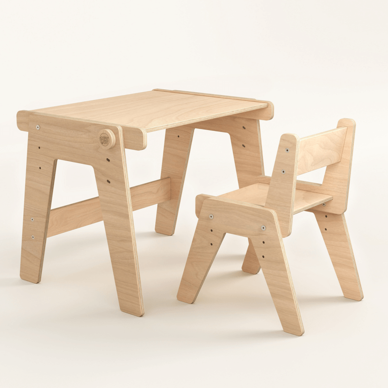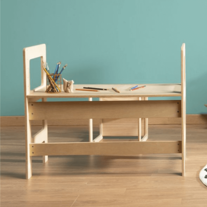 - Su diseño hace que no se centre en un uso individualizado del mueble, sino que se adapta a las necesidades que tiene el niño. Por eso, tiene distintos tipos de uso: la mesa puede ser banco y la silla puede servir de apoyo como una escalera.