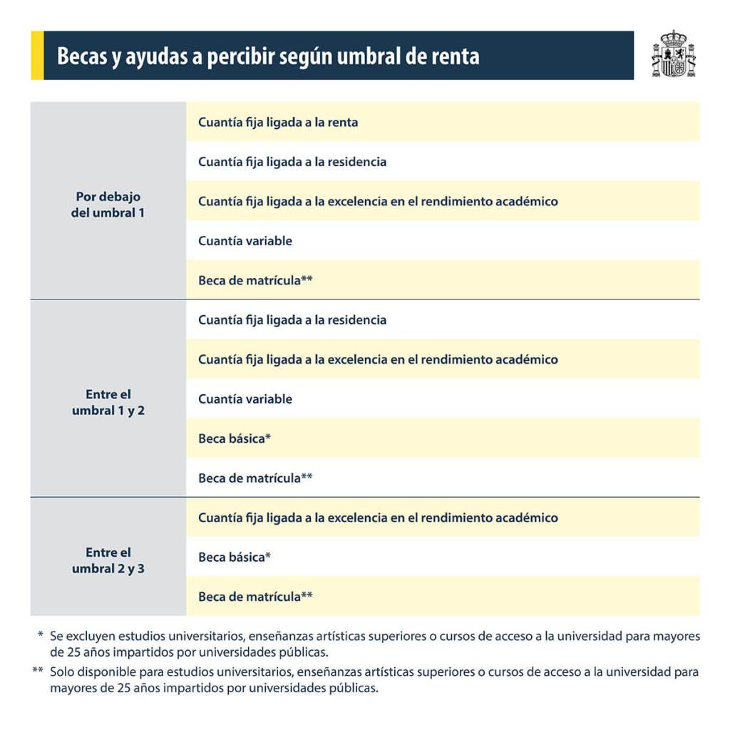 Estos son los umbrales y cuantías fijados por Real Decreto para el curso 2025-2026. Cabe matizar que existen excepciones, casos concretos donde las ayudas pueden diferir de lo señalado como norma general —las condiciones específicas se pueden consultar en el en el propio Real Decreto—: