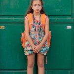 Niña con mochila escolar frente a una puerta verde antes de ir al colegio sola.